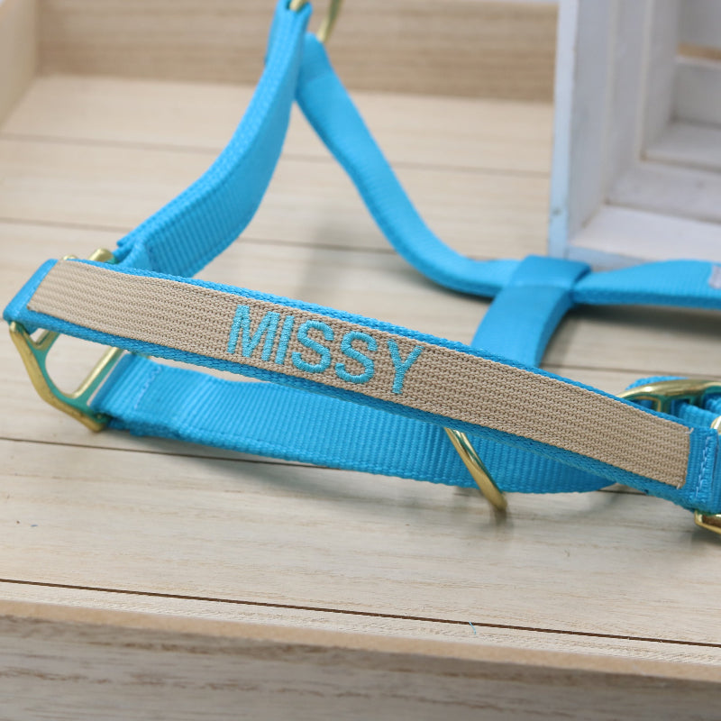 Die Farbe der Schrift ist passend zu der Farbe des Halfters, hellblau auf einem beigen Hintergrund, so wirkt das Halfter edel und dezent zugleich.