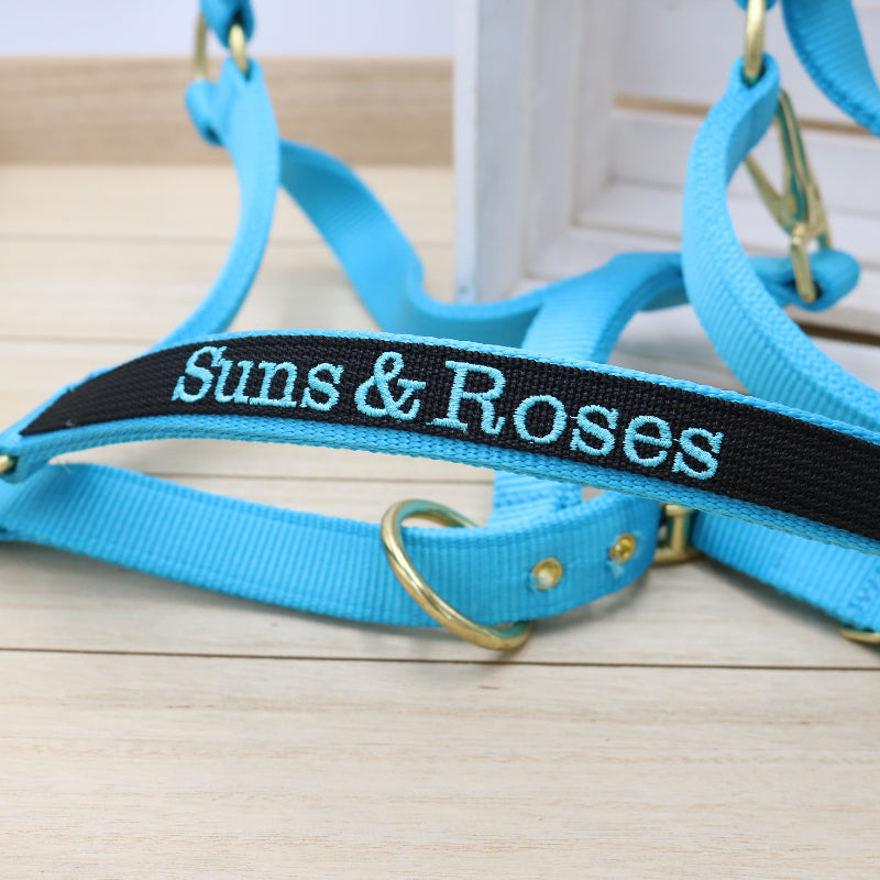 Die Farbe der Schrift ist passend zu der Farbe des Halfters, hellblau auf einem schwarzen Hintergrund, so wirkt das Halfter edel und dezent zugleich.