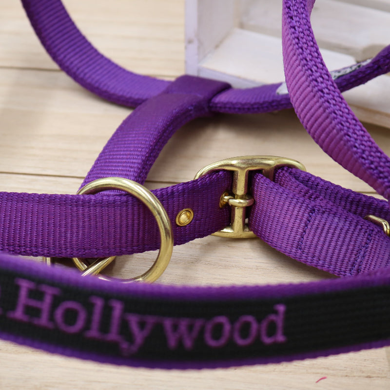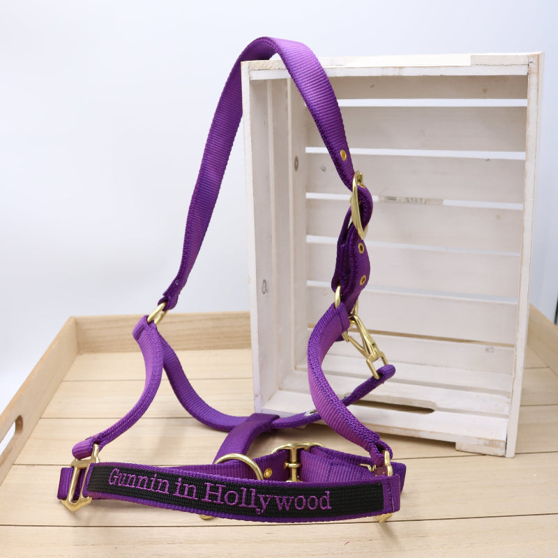 Die Farbe der Schrift ist passend zum Halfter, lila auf einem schwarzen Hintergrund, so wirkt das Halfter edel und dezent zugleich.