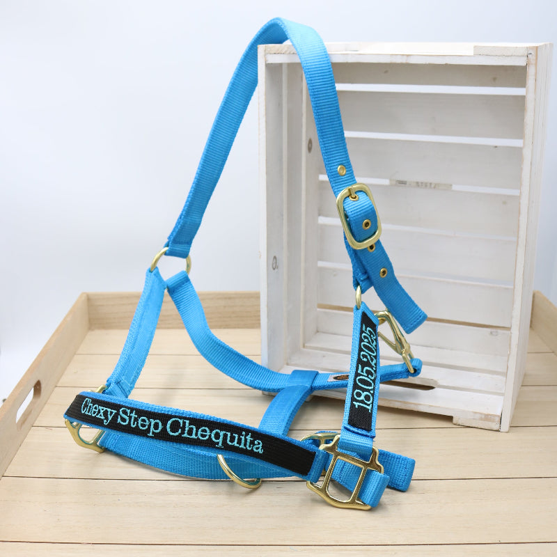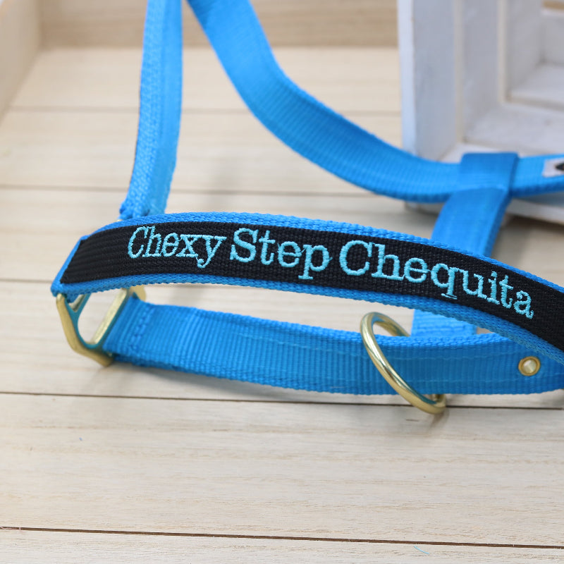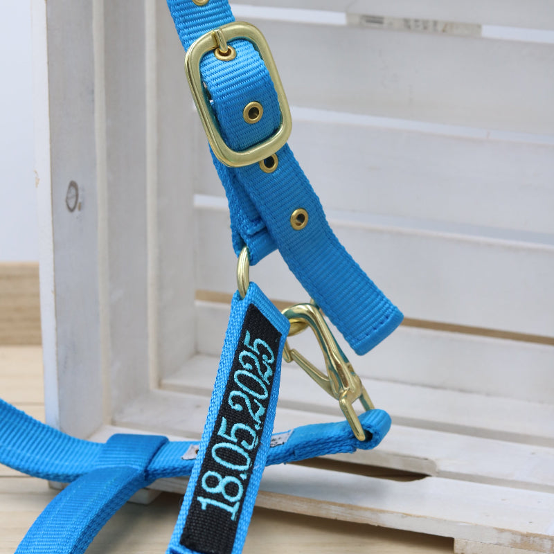 Die Farbe der Schrift ist passend zum Halfter, türkis auf einem schwarzen Hintergrund, so wirkt das Halfter edel und dezent zugleich.